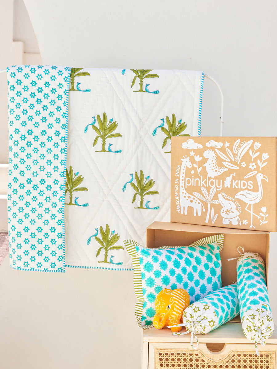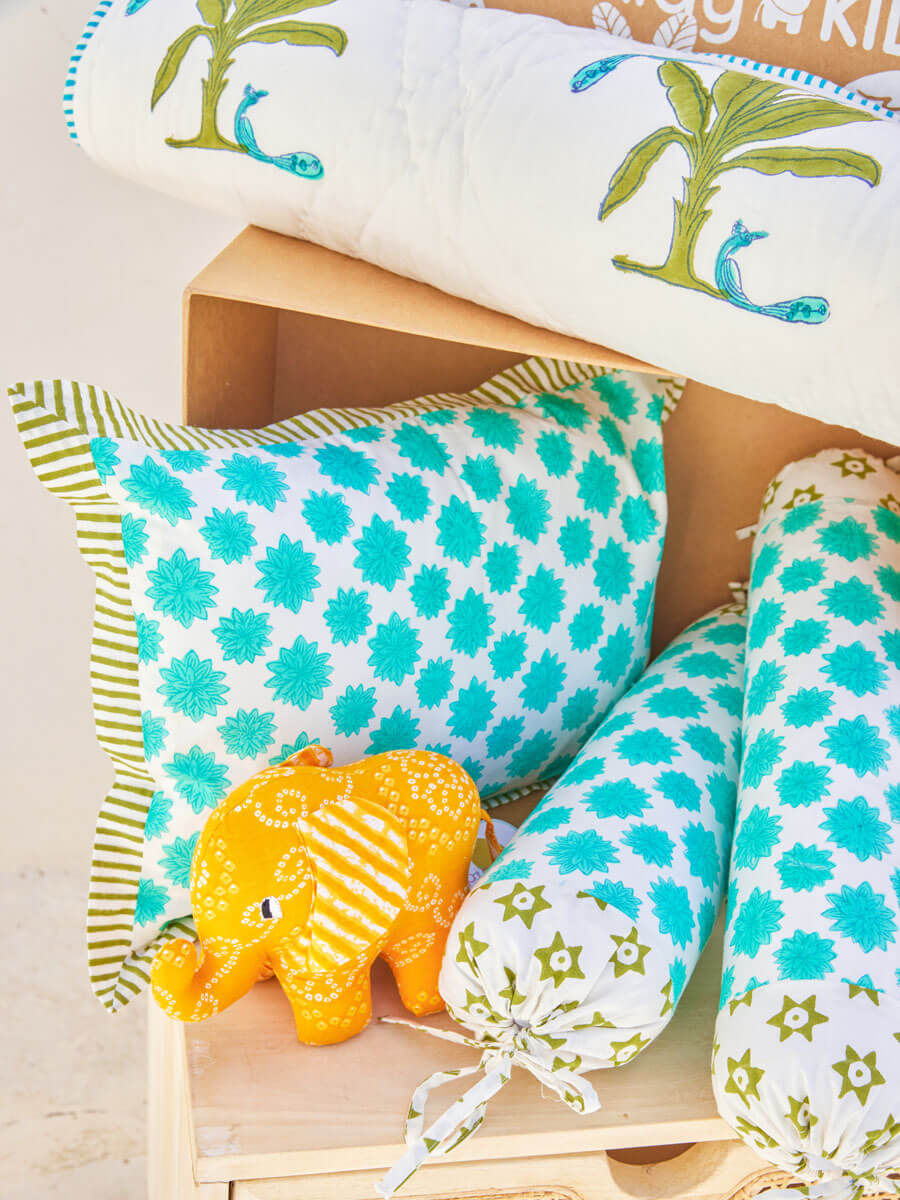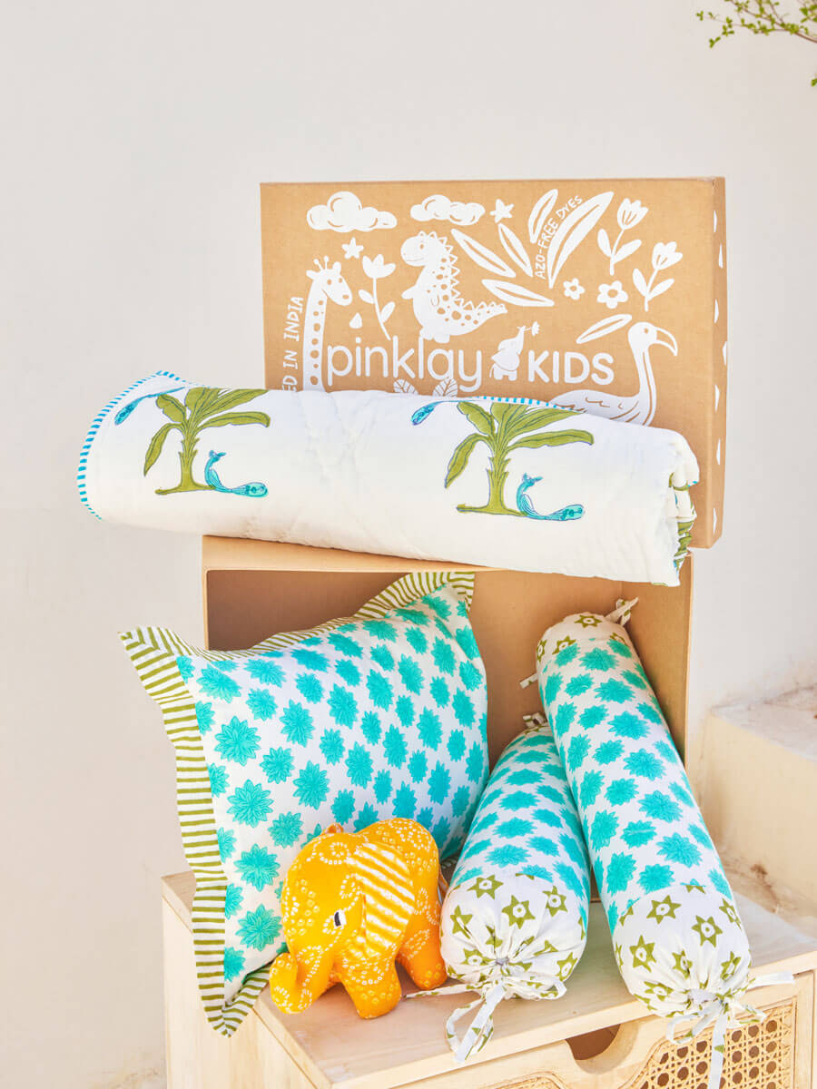 - Includes a baby quilt, pillow, two bolsters, and plush toy