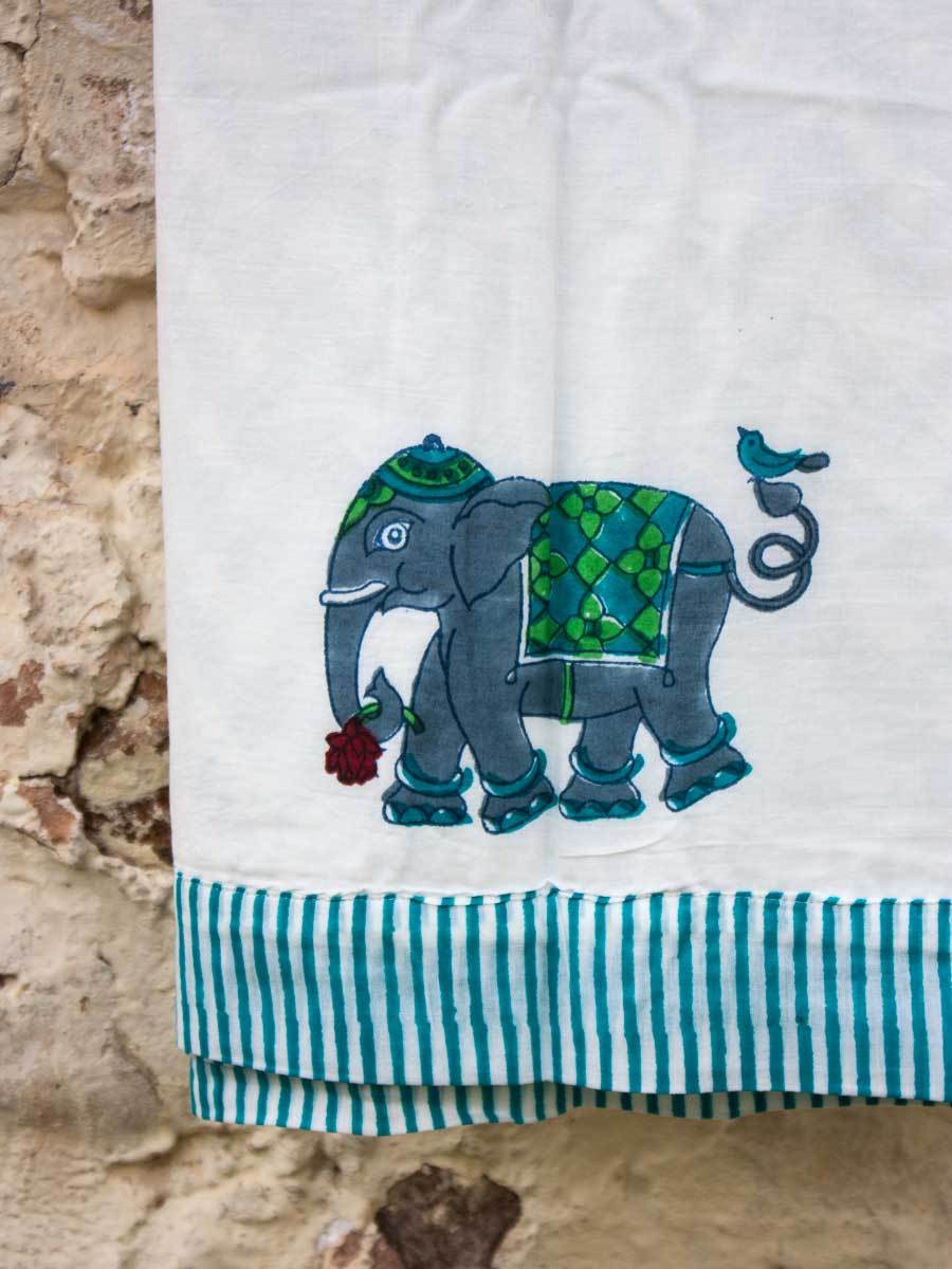 Kerala is an eternal poetry, one that begins with a magical sunrise and flows into floating lotus gardens. The fishermen at work in the pristine Kumarakom Lake, the tea estates, herds of majestic wild elephants in Munnar and colors of tropical trees, fruits, and flowers complete this poetry. And, the highlight is its biggest festival, Onam that celebrates the season of harvest. It is this time of the year that the city is bejeweled with festive fervor and joy. One of the many celebrations during this time is Vallam Kali (Boat Race), and Chundan Vallam is the boat used for this race. Meticulously crafted, these boats are popularly referred to as snake boats for their unique construction which has a rising rear and a long tapering front, resembling a snake with its hood raised. Tastefully decorated with green and scarlet silk umbrellas, we found our muse in these majestic vehicles that can carry as many as 128 paddlers. Each boat belongs to a village and is sacred. Our hand block story Onam centers around Chundan Vallam, a particularly complex motif to have been created and worked upon. The majestic elephant, gorgeous flowers, lotus, and plantain with a stunning pink bud complete the story. Our tribute to God's own country!