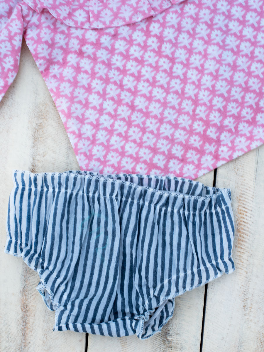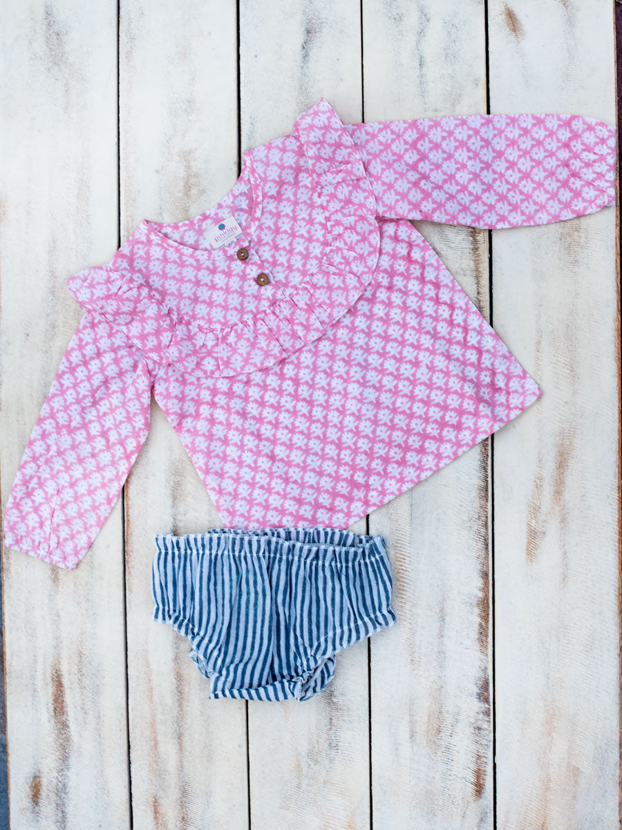 A true classic - this bloomer set is a must-have in your baby girl's wardrobe. Easy to put on and comfortable across seasons. The set includes one top and bottom.