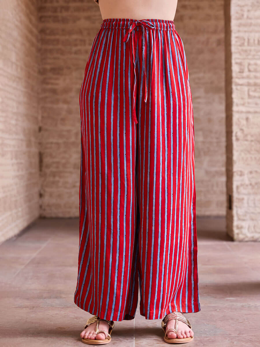 - Brick Red Striped Palazzo Pant handcrafted in modal fabric using traditional Bagru dyeing technique