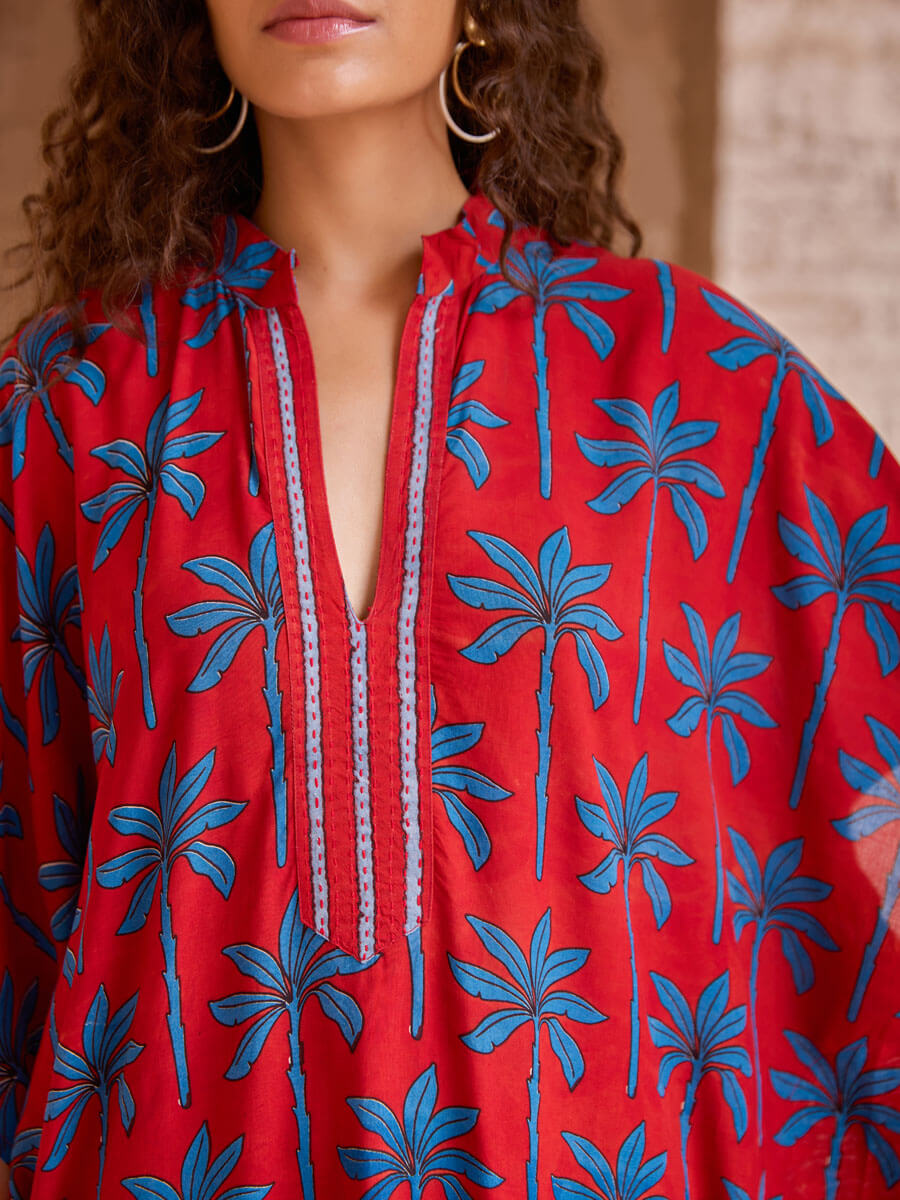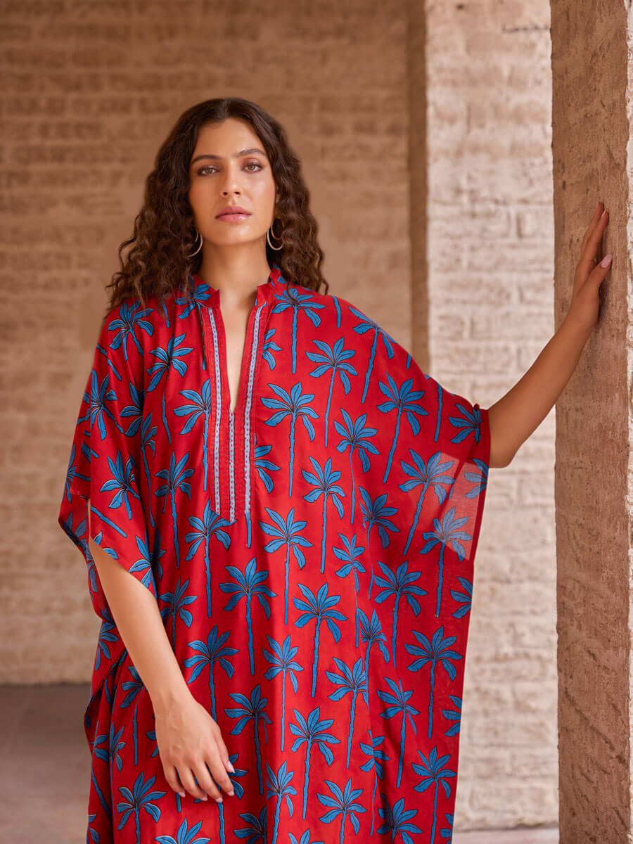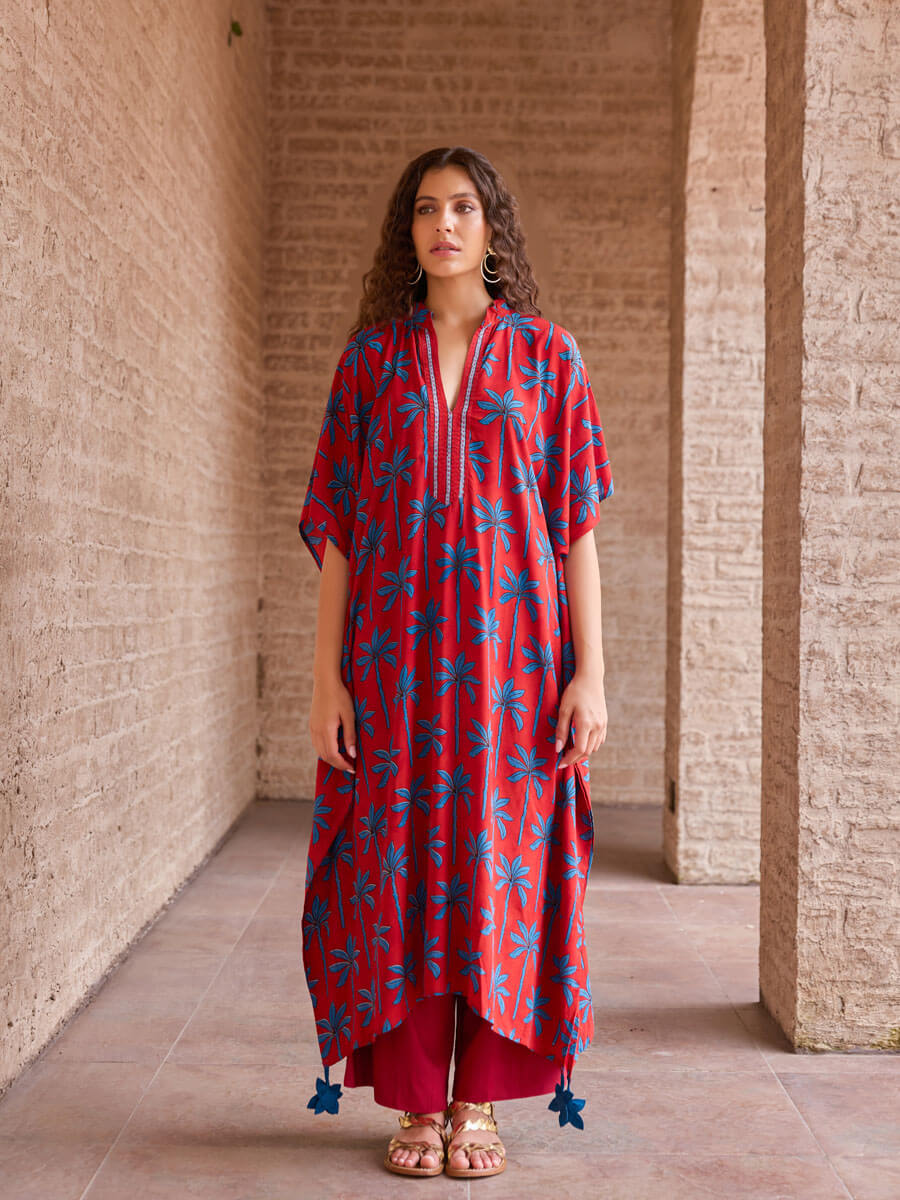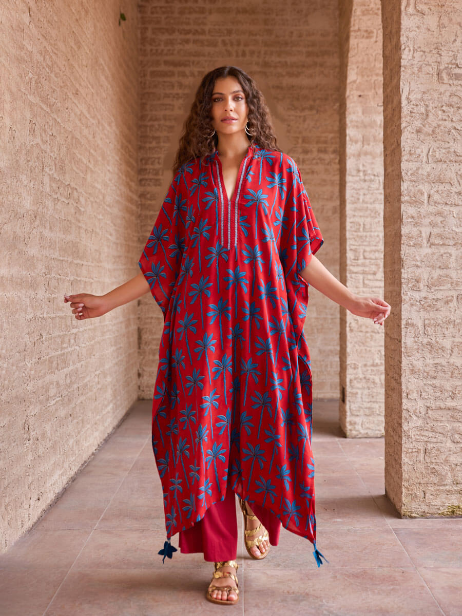- Kaftan features a kantha-embroidered mandarin neckline for everyday chic