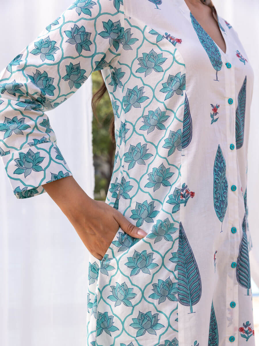 - Kurta: Hand block printed on fine cotton | Features pockets