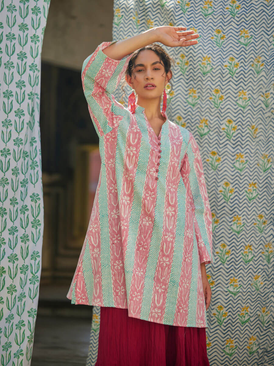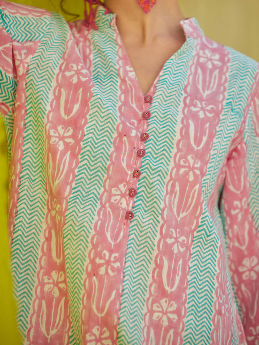 - A-line kurta silhouette with button-down detailing