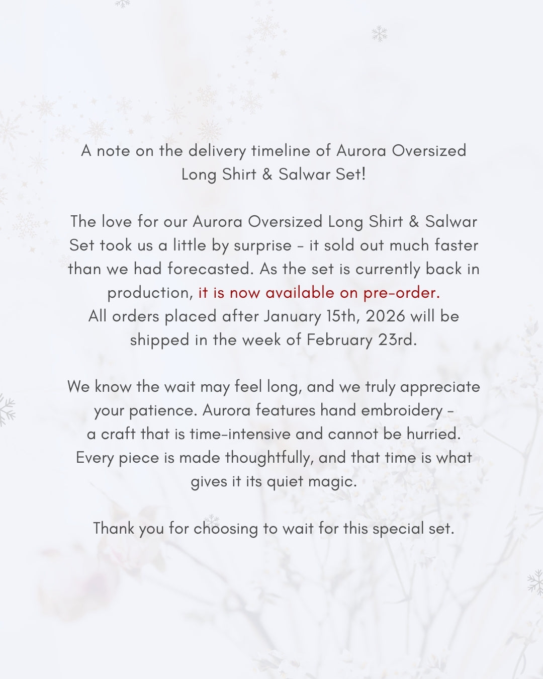 - All orders placed after January 15th, 2026 will be shipped in the week of Febuary 23rd.