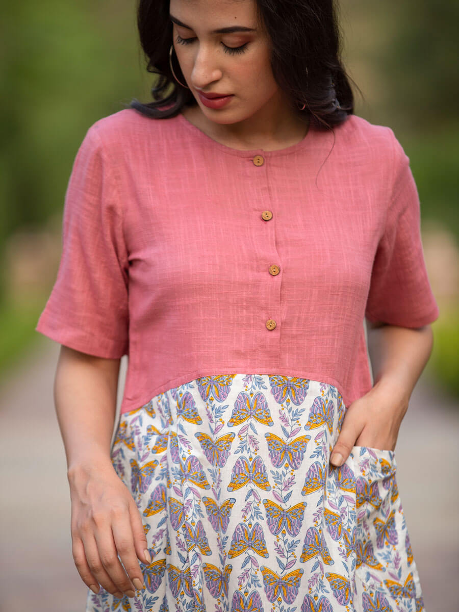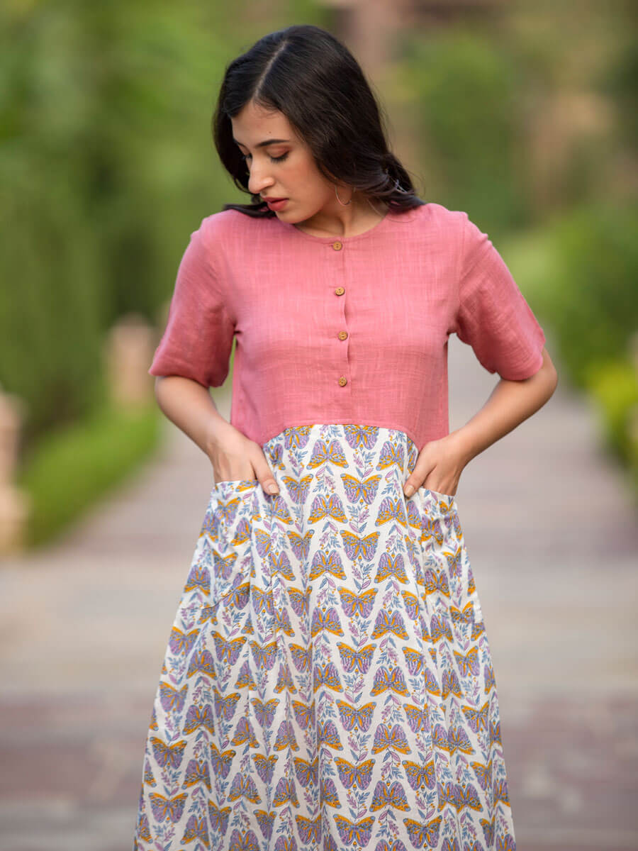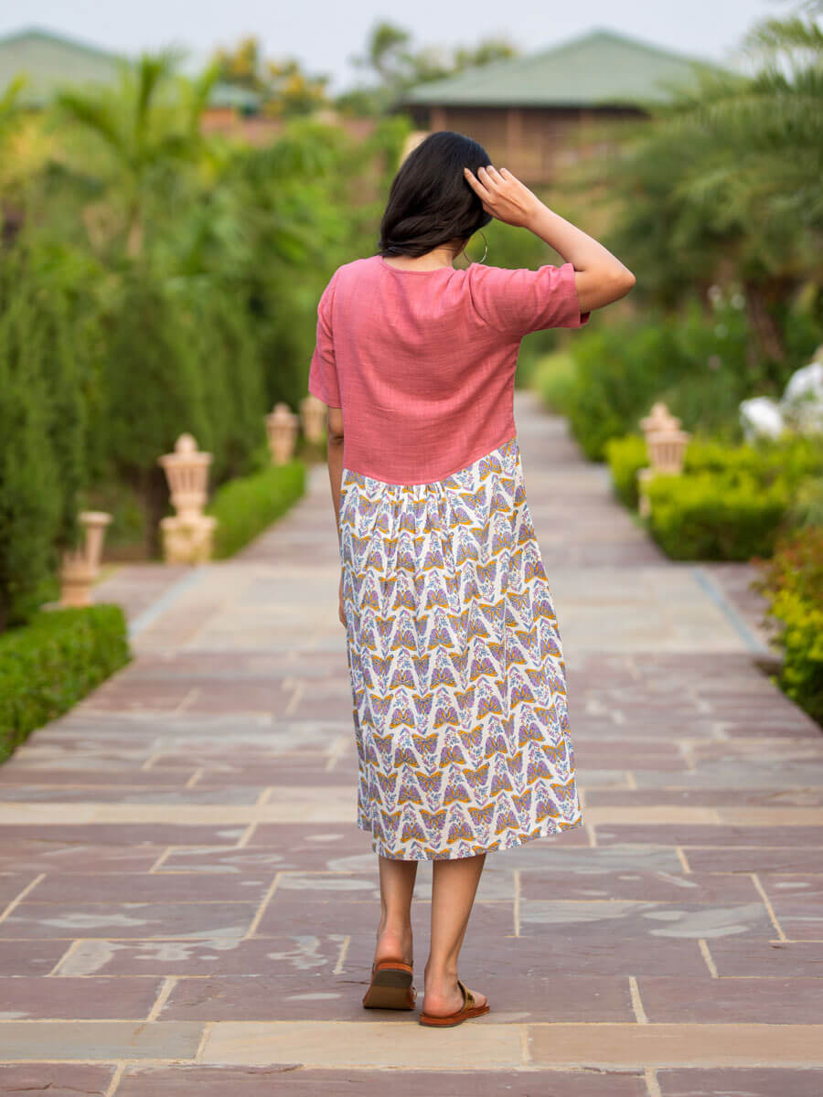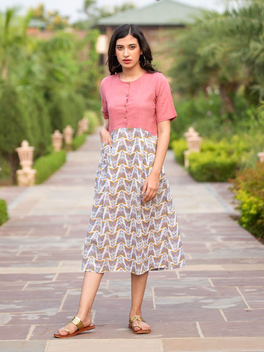 The happiest dress ever! Peach cotton slub bodice combined with hand block printed cotton in our signature motif. Pleats and pockets take the fun and functionality a notch higher!