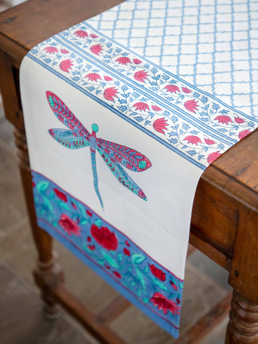 A hand block print table runner on cotton canvas in our signature design. Make a set with our matching selection of table cloth, table mats, table napkins, tea cozy, and more.
