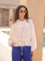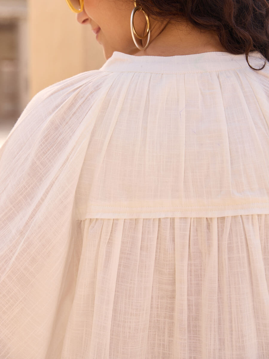 - Shirt features peplum flare and balloon sleeves