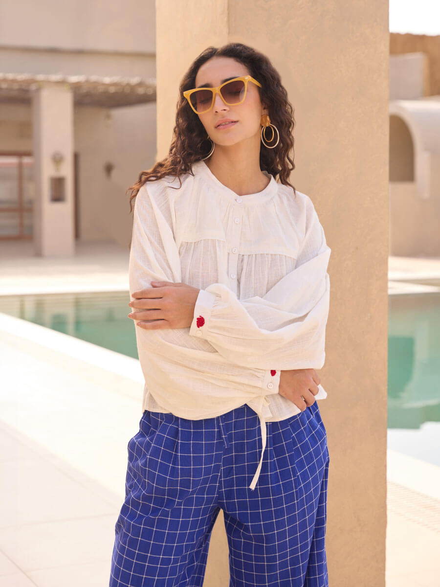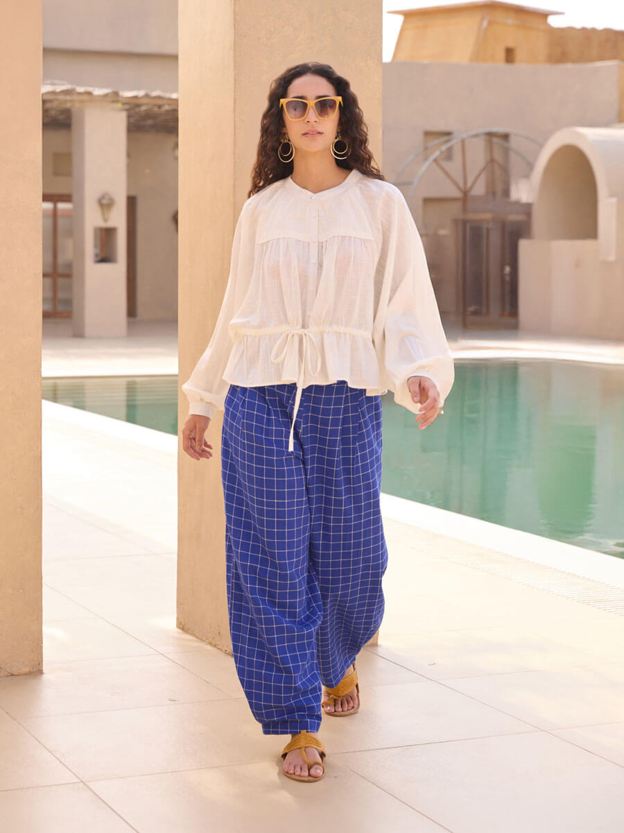 - Versatile shirt with complementing lantern pants