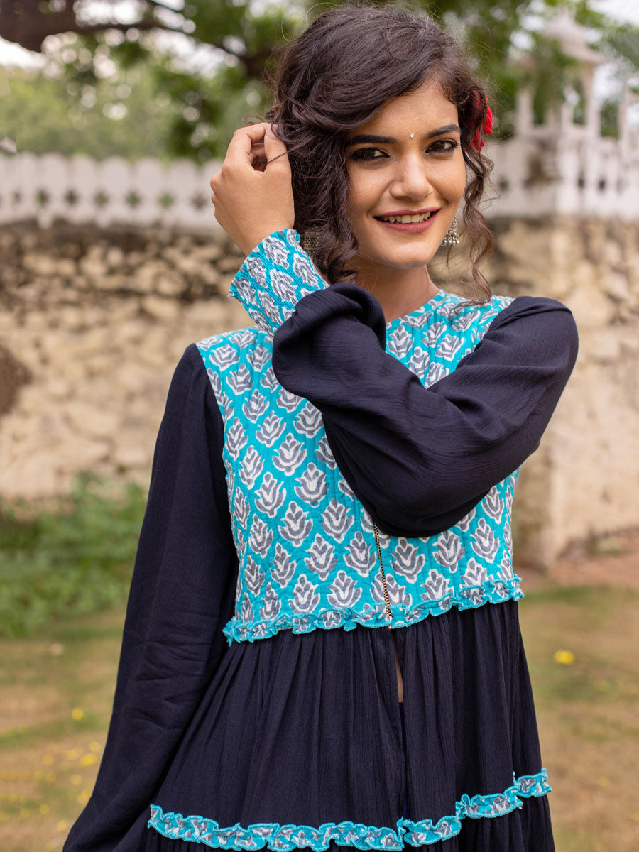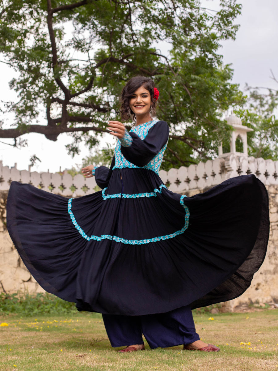 A gorgeous centre slit anarkali dress featuring quilted bodice, dramatic tiered bottom and wide fall bishop sleeves. Goes best with palazzos, cigarette pants, denims or a skirt.