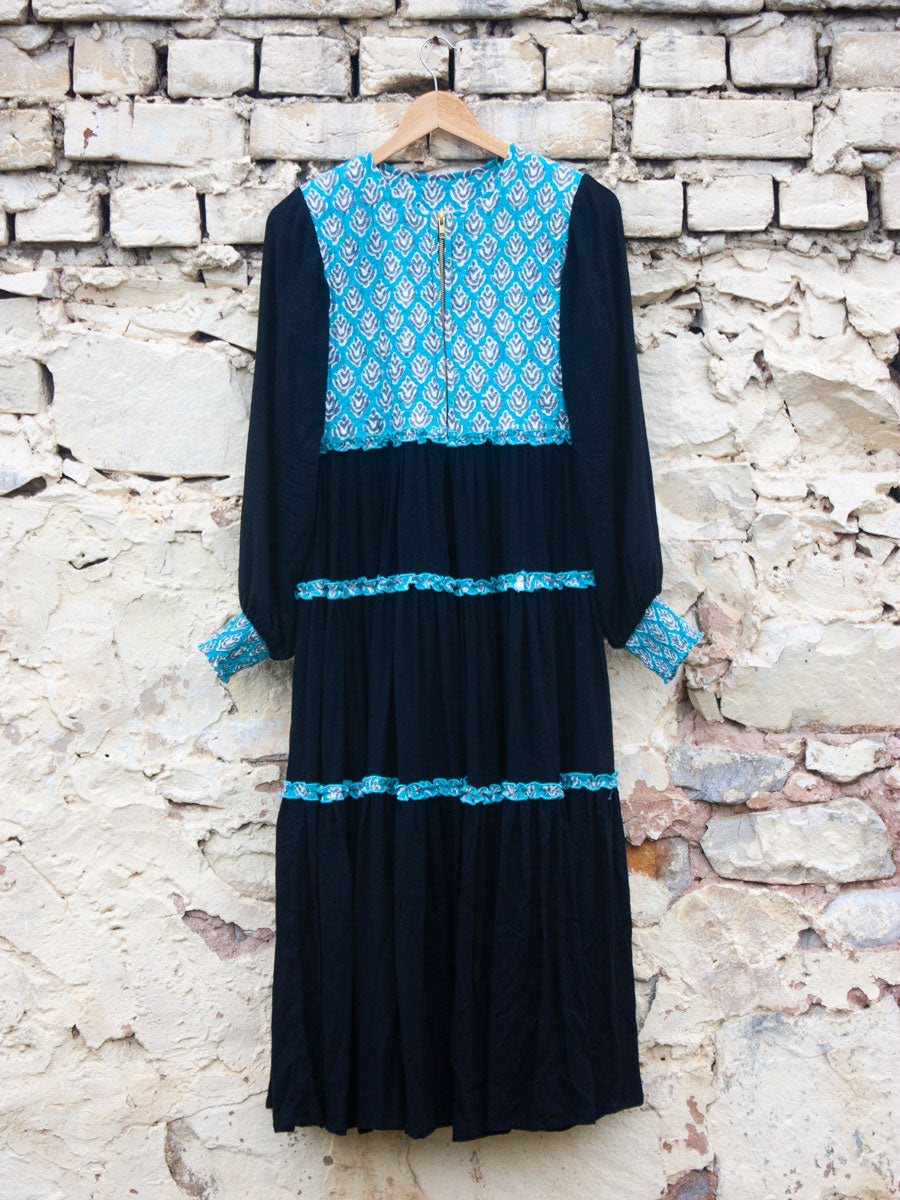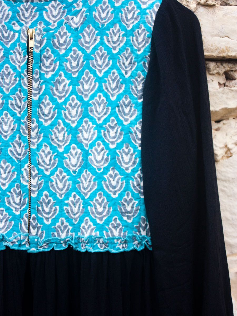 The bodice of this garment is hand block printed and quilted on finest cotton, tiered bottom and sleeves are crafted in viscose with detailing. The sizes mentioned are garment sizes. Our model is 5'6" and is wearing XS size.