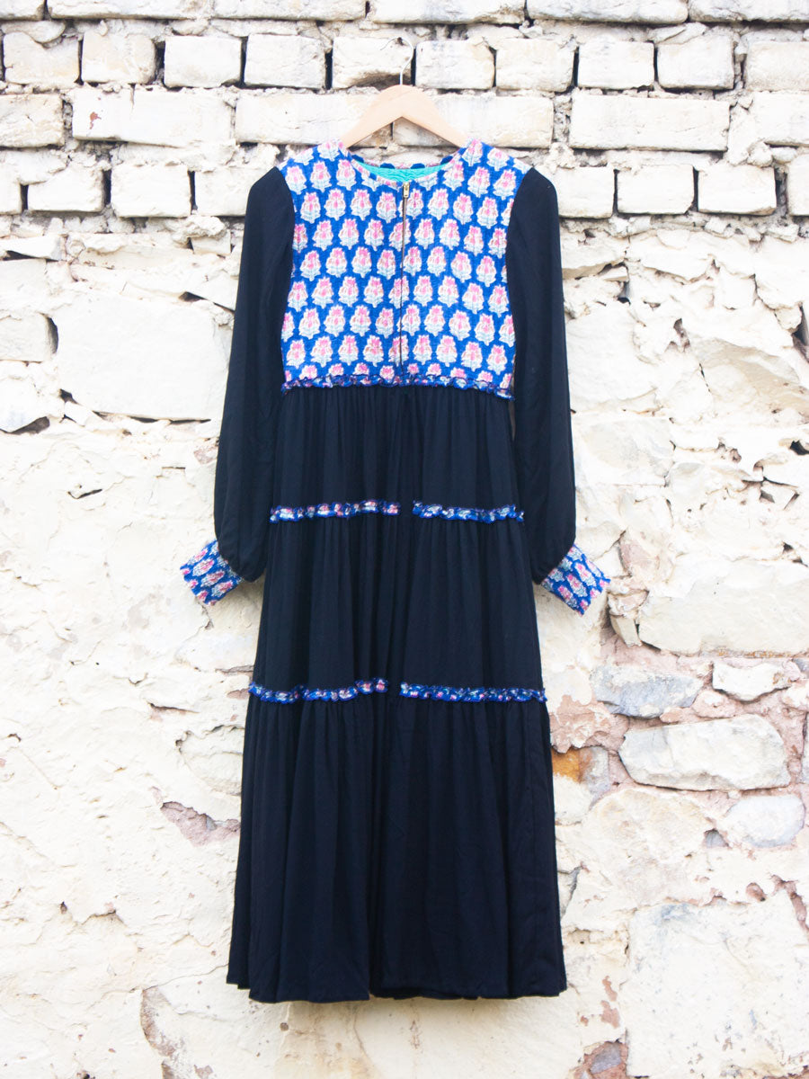 The bodice of this garment is hand block printed and quilted on finest cotton, tiered bottom and sleeves are crafted in viscose with detailing. The sizes mentioned are garment sizes. Our model is 5'6" and wearing XS size.