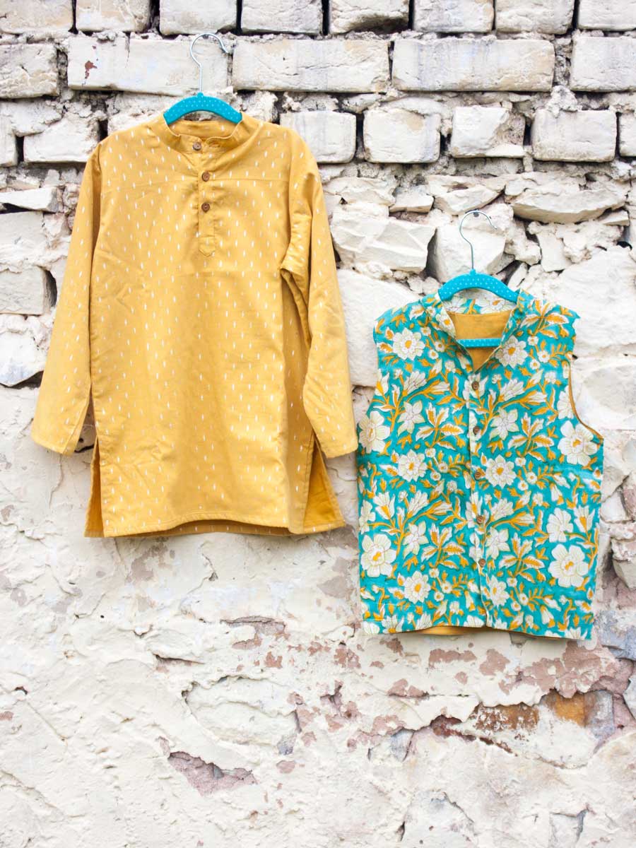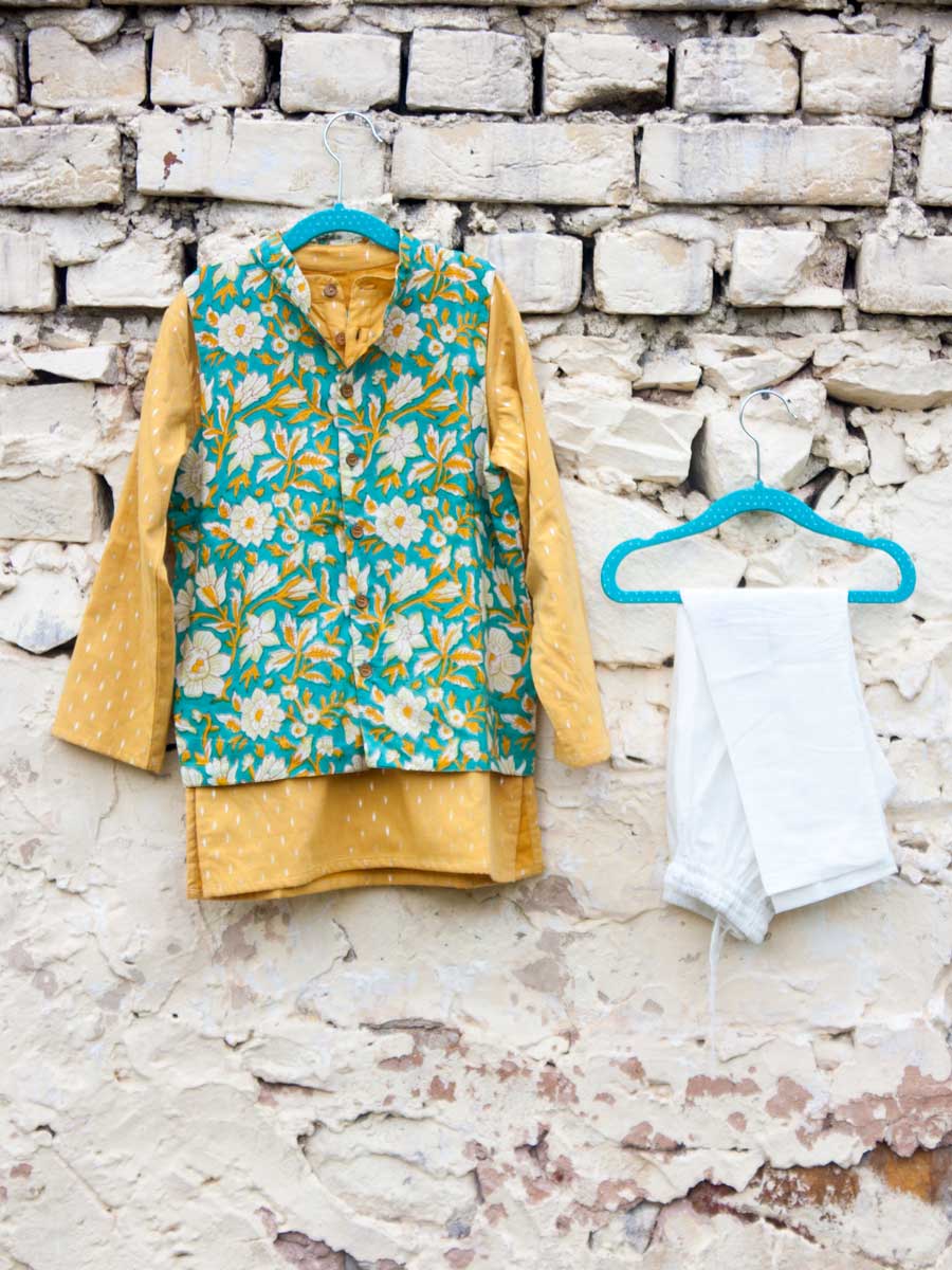 Presenting festive kurta and jacket sets for our little customers. Keeping true to our style and quality commitment, each piece is handcrafted in high-quality embellished cotton and certified organic cotton. Hand block printed with festive butis, embellished with intricate buttons and designed to be super comfortable; our festive collection makes kids sparkle!