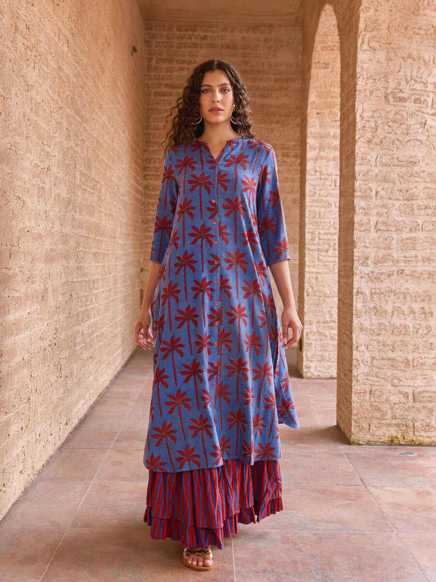 - Regular-fit A-line cotton kurta handcrafted using Bagru dyeing technique