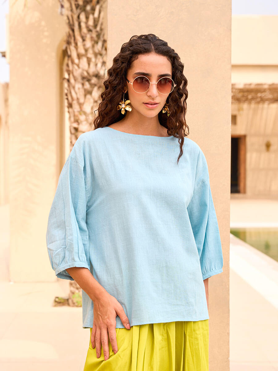 - Flattering three-quarter balloon sleeves and elegant boat neckline